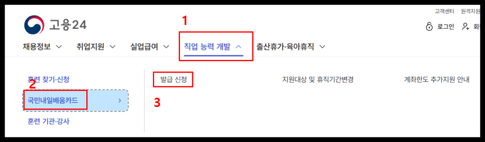 직업 능력 개발창에서 👉 국민내일배움카드 👉 발급 신청 클릭해주세요.