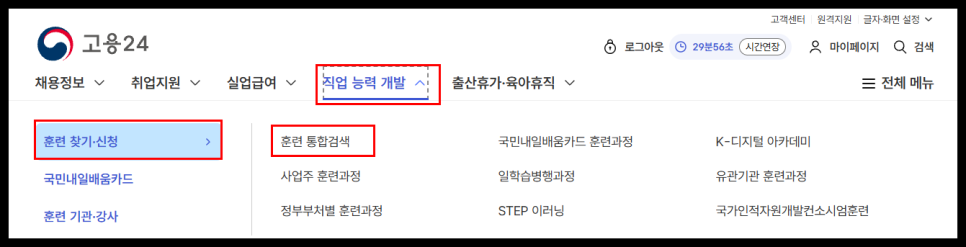 '직업능력개발' 메뉴에서 '국민내일배움카드 발급 신청'